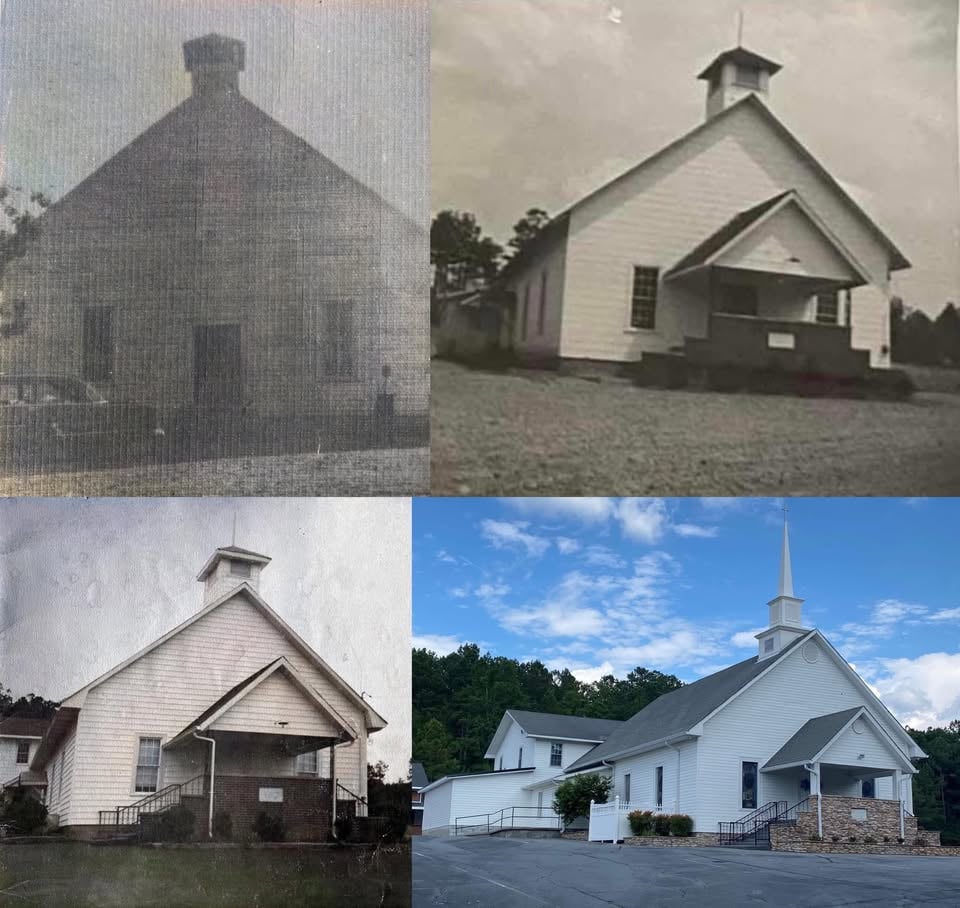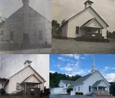 The first church was built out of heart pine with planks going up and down with a strip over the cracks. The pillars were of heart pine and rock high off the ground of the west side and low on the east side. It had high steps up to the front door. The front faced the south with the pulpit in the north end. The first church building was small and during the summer all the people couldn't get inside the building. A Brush Arbor was built behind the church building.